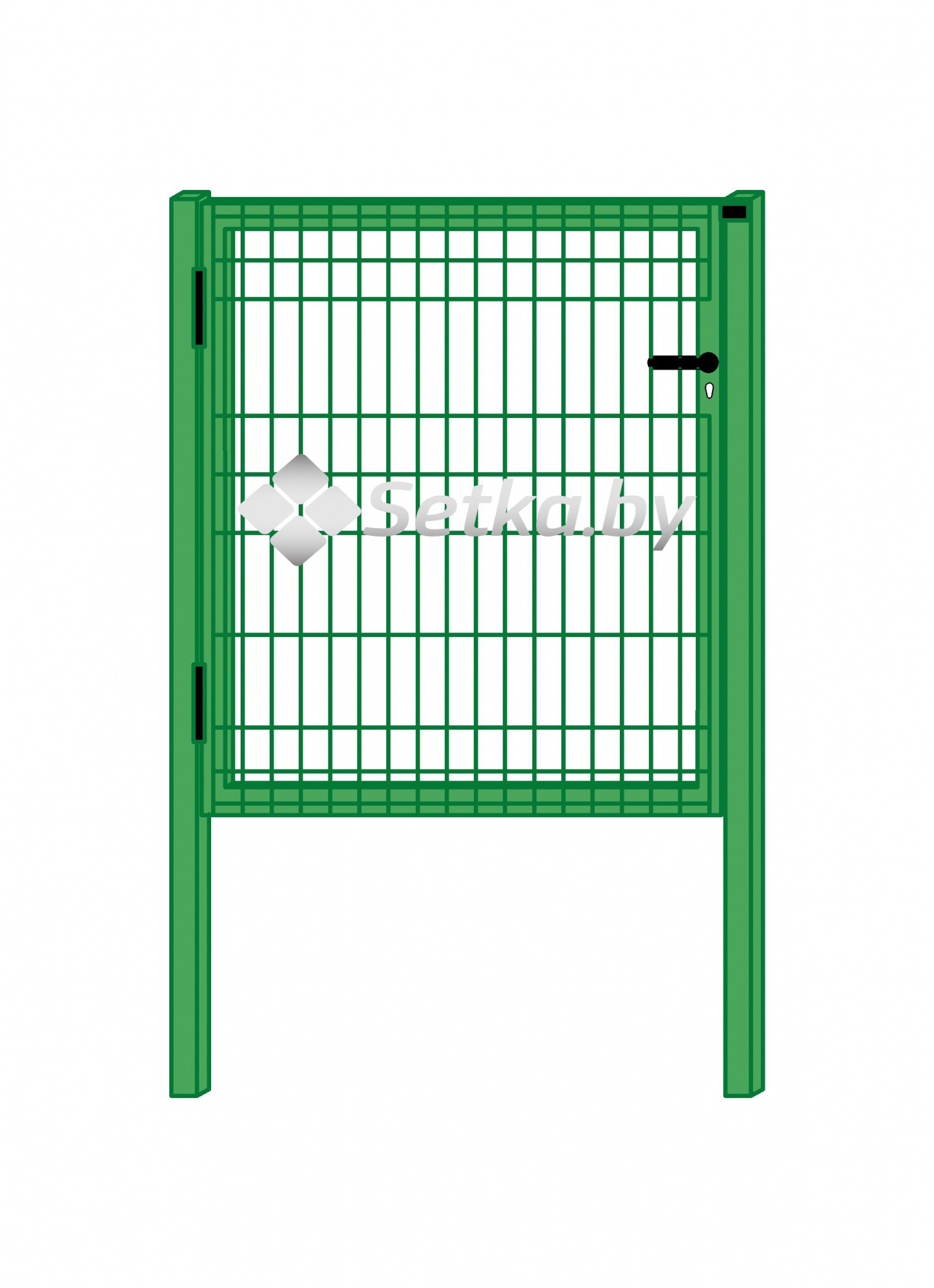 Калитка изготавливается из 3D-панели оцинкованной, диаметр проволоки 3,8 мм.. Для изготовления каркаса используются трубы с прямоугольным сечением 40х40х1,5. Для столбов с петлями – трубы 60х40х2/3. Готовое изделие в собранном виде покрывается полимером любого цвета по каталогу RAL.