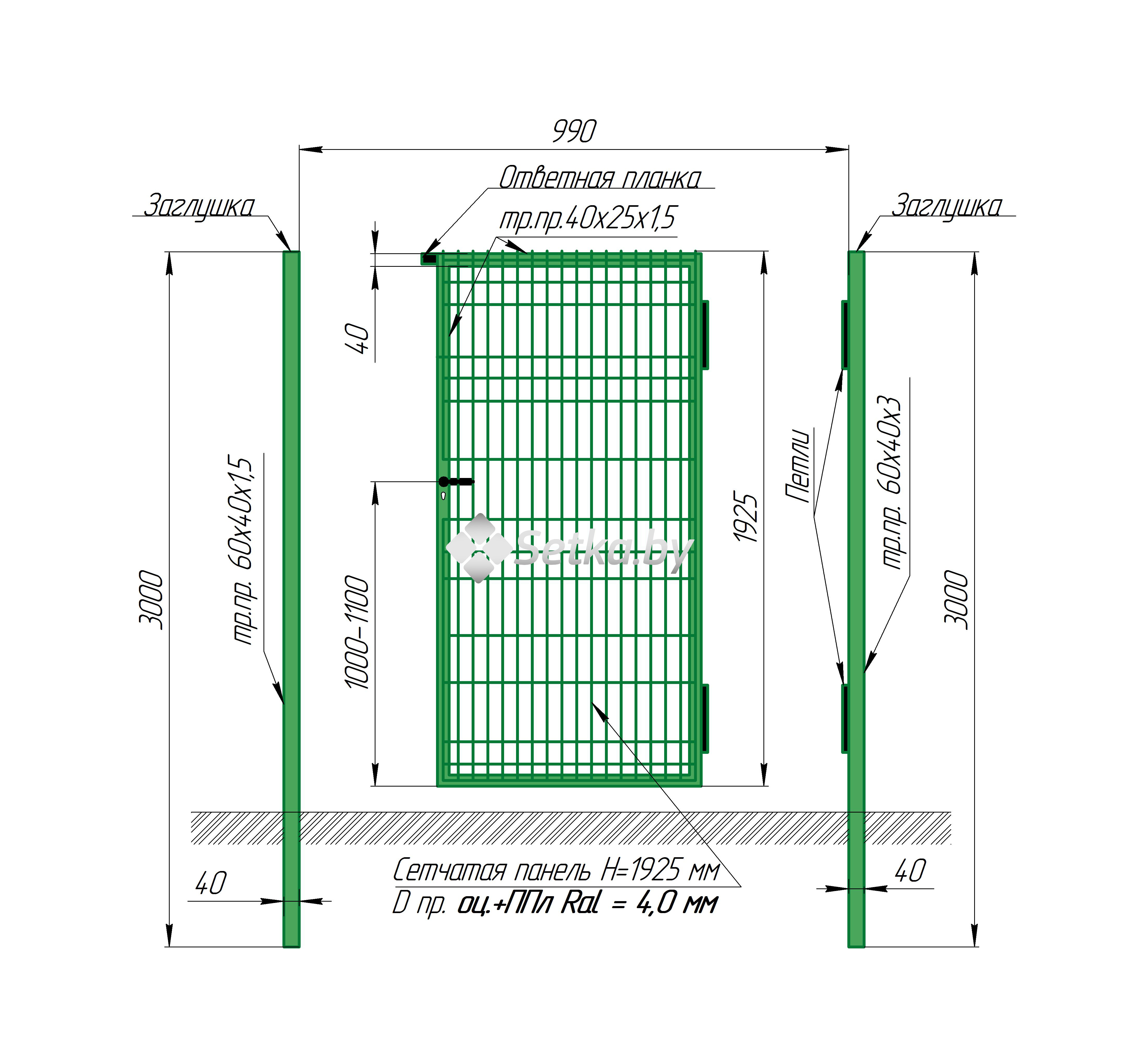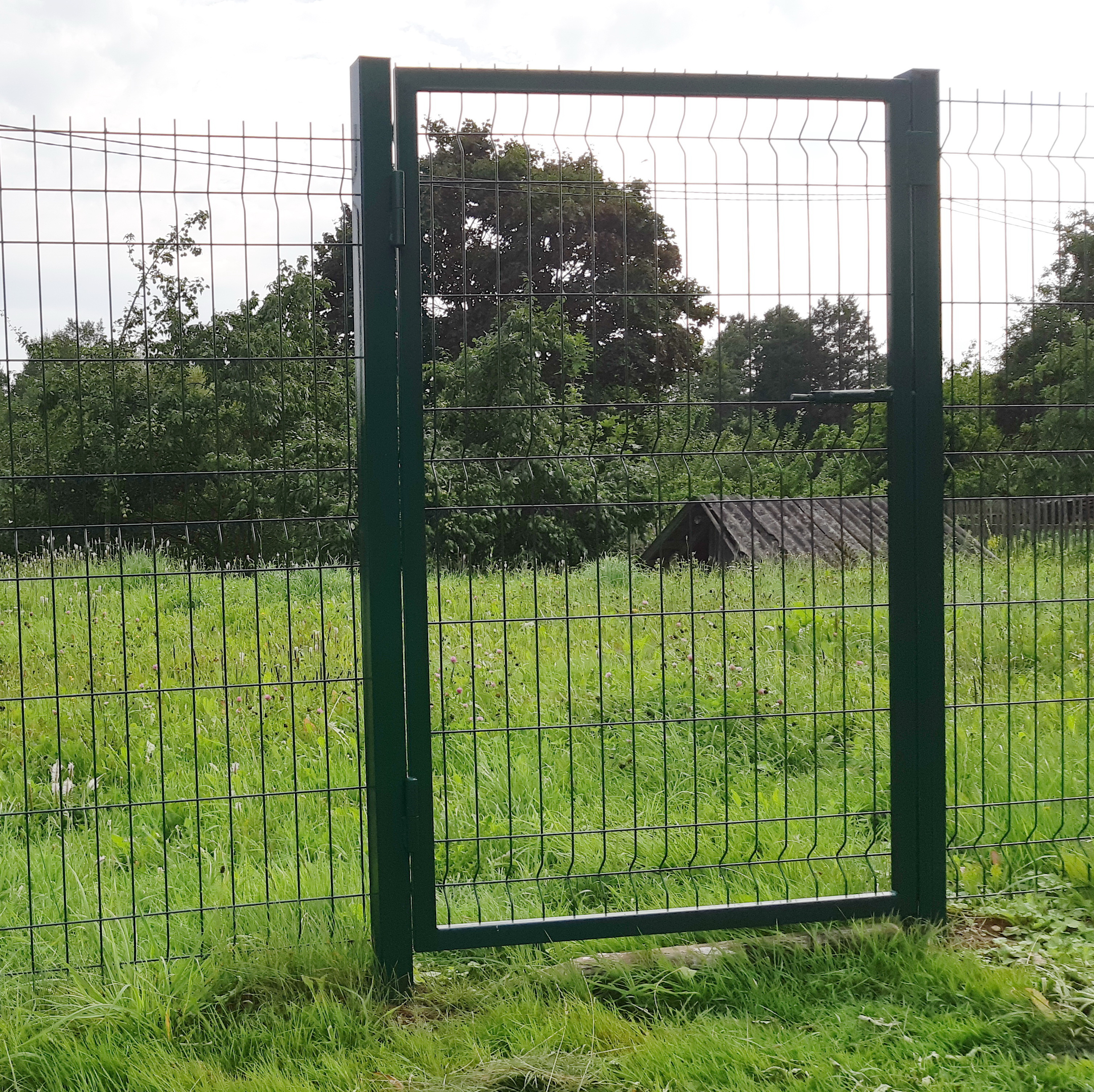 Стандартные размеры калитки: 1,93×0,99 м. Параметры столба: 60×40×высота 2700 мм. Изготовим также калитки любых других размеров по Вашему заказу. Цена калитки указана в комплекте со столбами (врезной замок, ручка, ключи). Калитка изготавливается из сетчатой 3D-панели, диаметр проволоки 3,8 мм.. Для производства калитки используется 3D - панель оцинкованная диаметр проволоки 3,8 мм. Для изготовления каркаса используются трубы с прямоугольным сечением 40х40х1,5. Для столбов с петлями – трубы 60х40х2/3. Высота изделия – 1,93 м, ширина – 0,99 м. Готовое изделие в собранном виде покрывается полимером любого цвета по каталогу RAL. Стандартный цвет зеленый, но вы можете выбрать другие варианты исполнения .