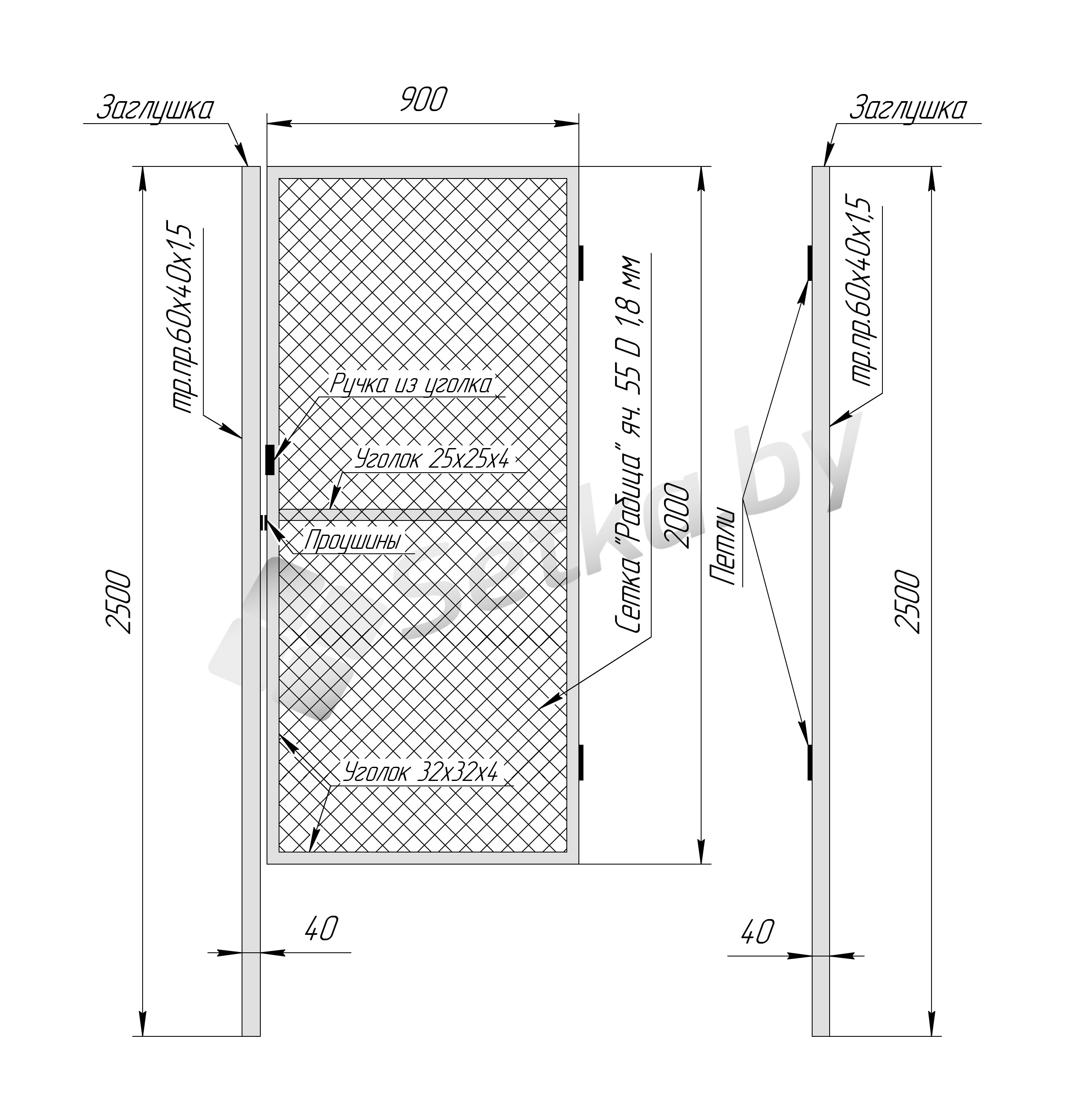 Каркас изготавливается из уголка 32х32х4мм, покрытие - грунт, заполнение - сетка Рабица оцинкованная, ячейка 55мм., диаметр проволоки 1,8мм. Cтолб высотой 2,5м. Размеры столба 60х40х1,5мм