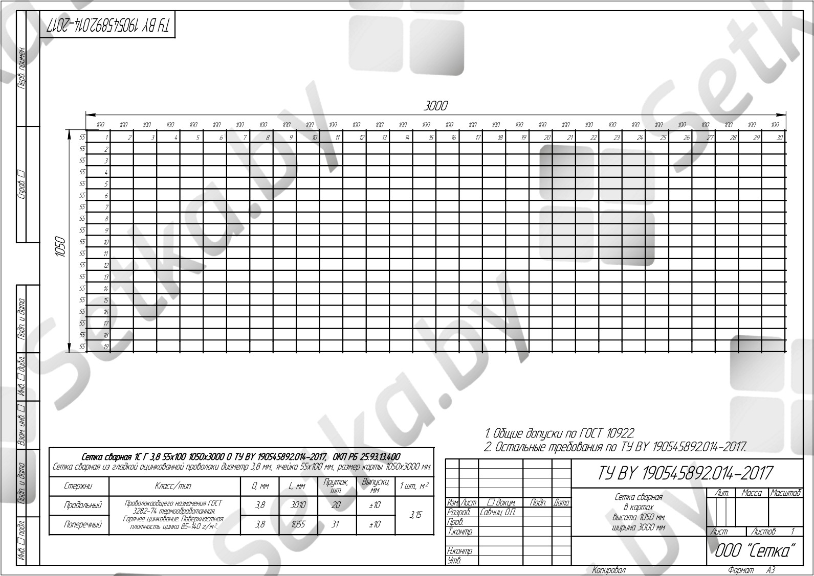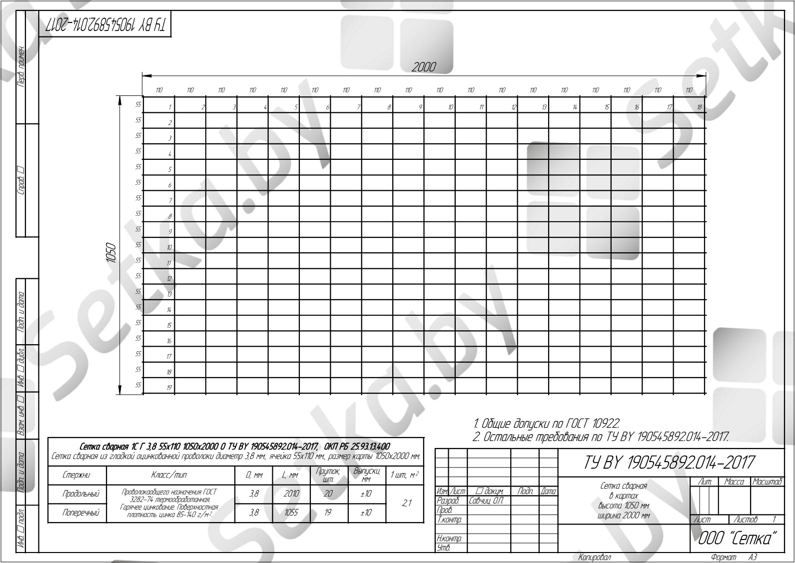 Производитель ООО "Сетка" Материал оцинкованная Проволока 3.8 ТУ BY 190545892.014-2017 Ячейка, мм 55x100 Размер, мм 1,05 х 2м,1,05 х 3м
