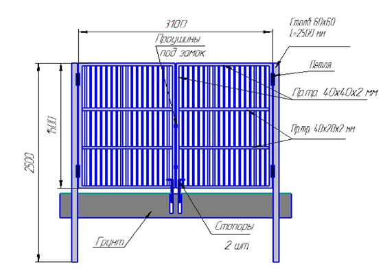 Ворота МП (металлопрофиль) оцинковаанные в комплекте со столбами, 3,10×1,5 м