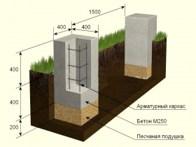 Здесь серьезный требований к основанию нет. Достаточно просто подготовить ямки глубиной до метра, засыпать подушку в 0,2 метра, и поверх нее насыпать сухую смесь из щебня, цемента и песка, качественно утрамбовать каждый слой и пролить основание водой.