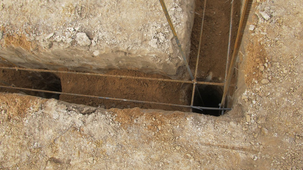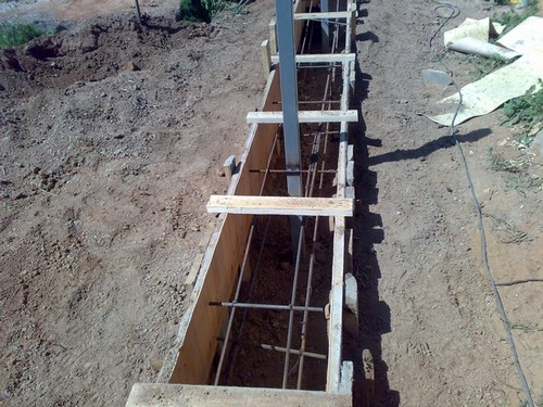 5. Установка столбов в подготовленные лунки. Идеально делать это после того, как готово армирование, таким образом, вы сможете закрепить столбы в необходимом положении к арматуре. Положение определяется с помощью строительного уровня.