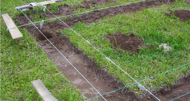 2. Земляные работы. Когда с разметкой покончено, нужно выкопать траншею глубиной до полуметра для монтажа ленточного фундамента. В местах, где располагаются столбы выкапывается более глубокая лунка до 1-1,5 метров. Лунке можно копать с помощью садового бура. Не забудьте подготовить песчаную подушку по дну траншеи и лунок 20-30 см.